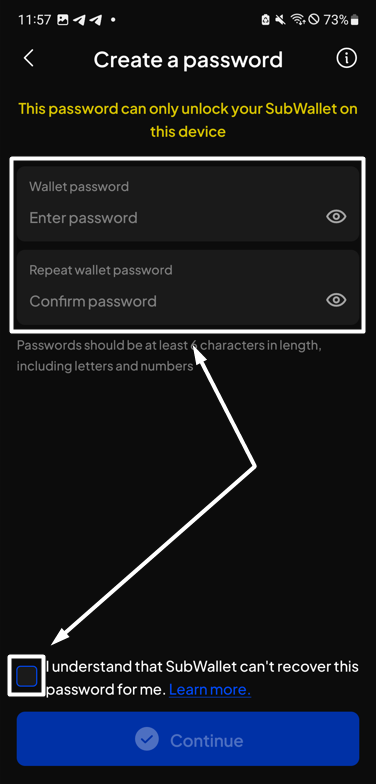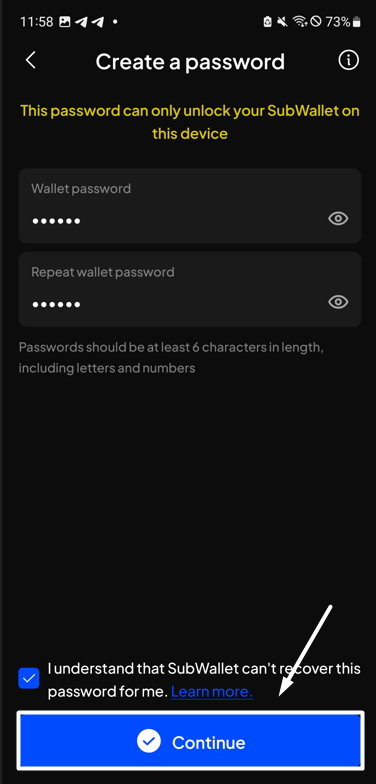 **Step 2:** Enter a strong password with at least 6 characters and hit the "**I understand that SubWallet can't recover the password for me**" box.