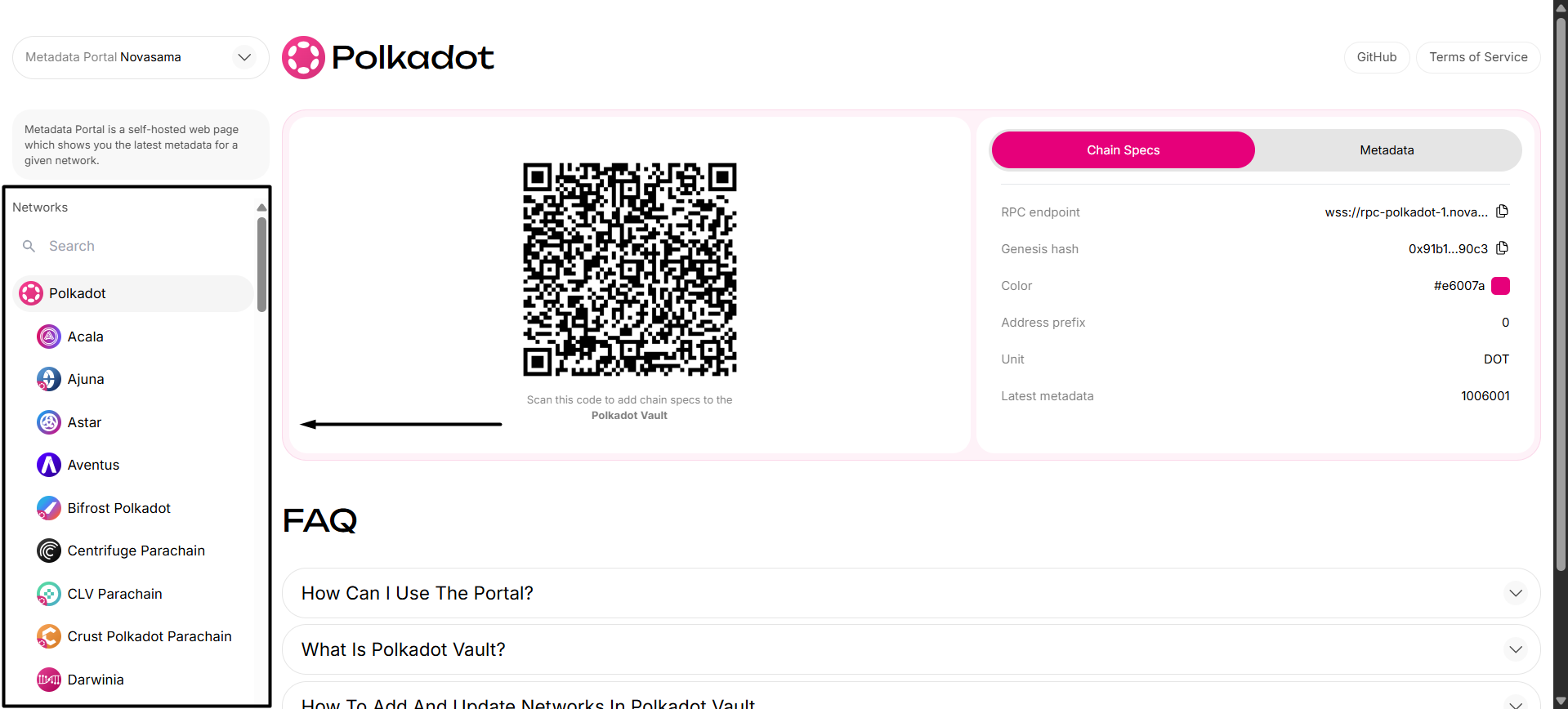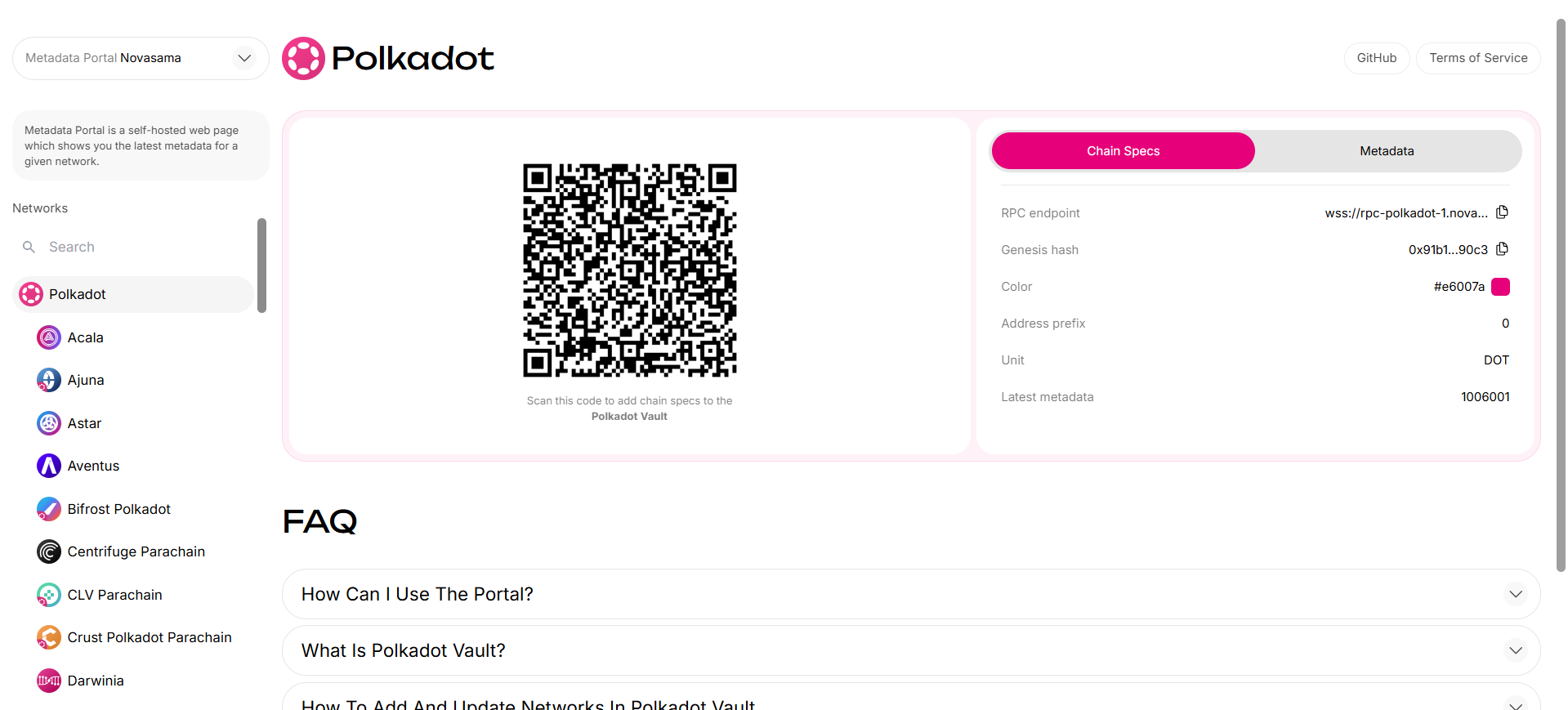 **Step 1**: Navigate to the [Novasama Metadata Portal](https://metadata.novasama.io/#/polkadot). The interface should be like the image below.