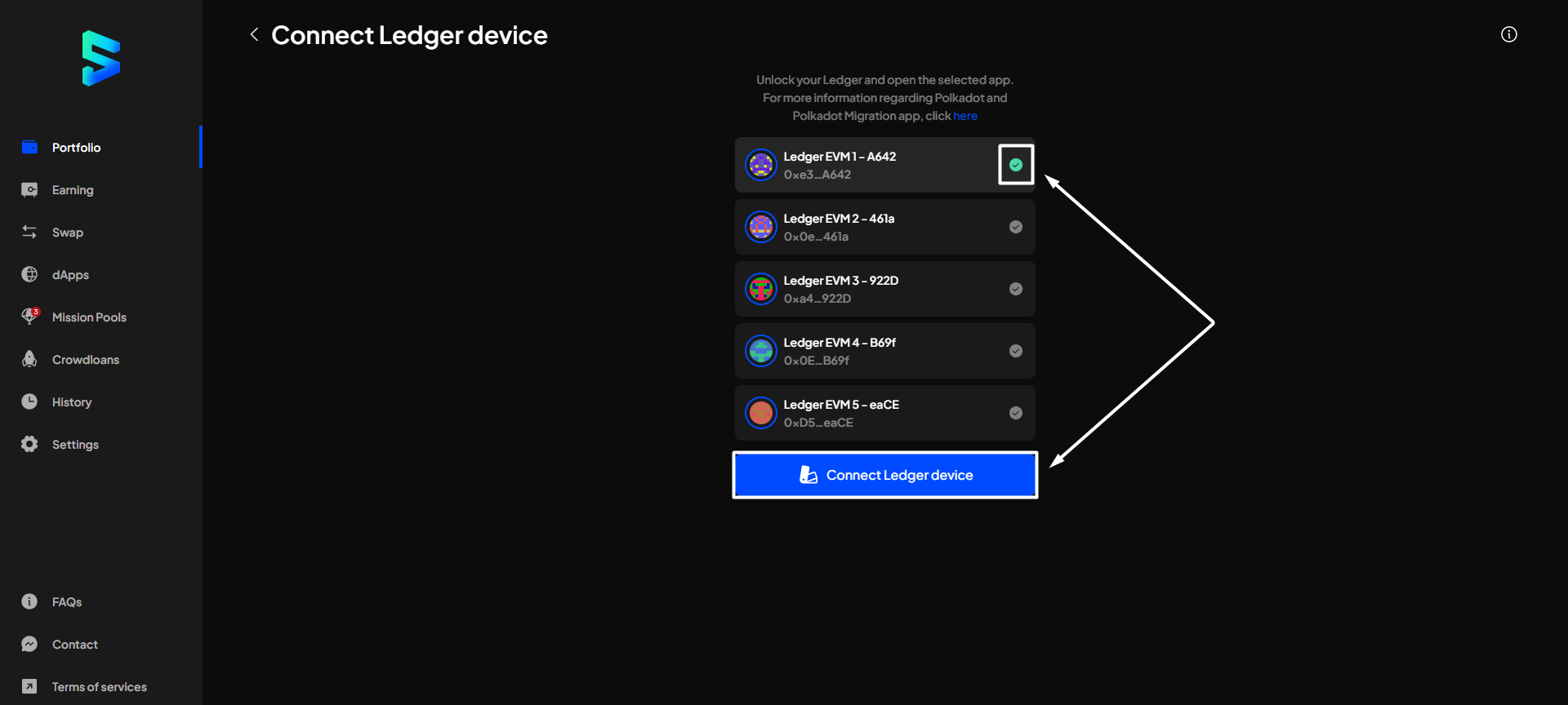 Step 7: Choose the account(s) you want to use, then click "Connect Ledger device".
