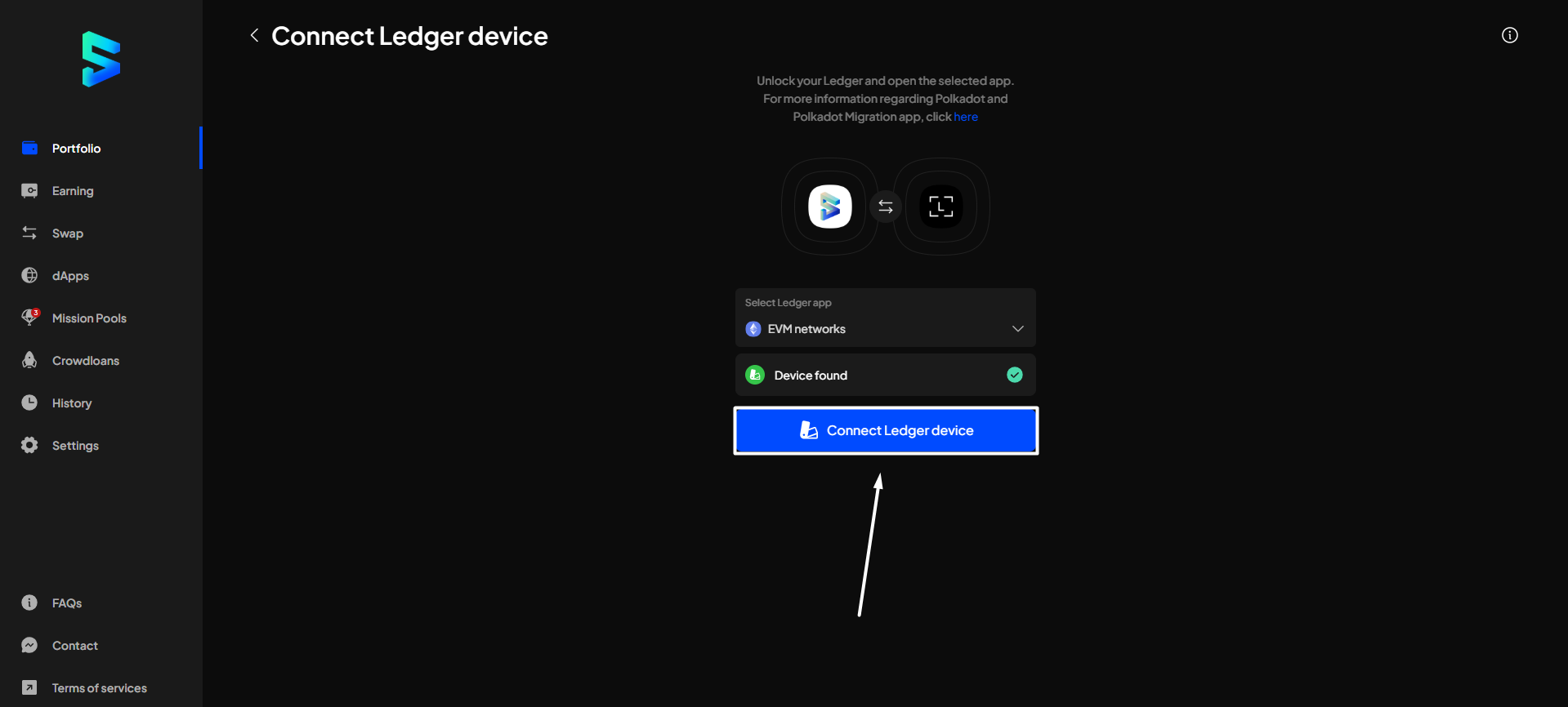 Step 6: After your Ledger has been successfully found by SubWallet, click "Connect Ledger device".