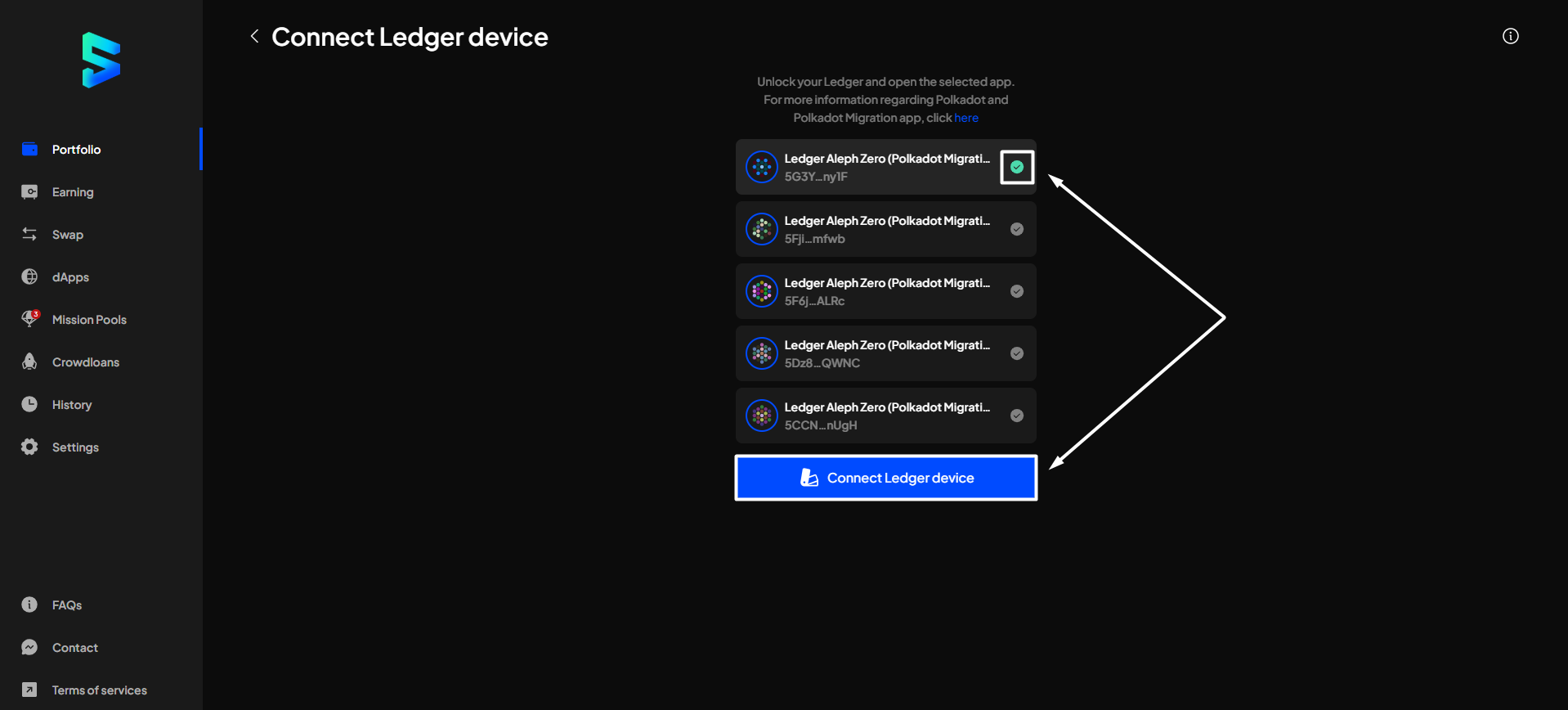 **Step 7**: Choose the account(s) you want to use, then click "**Connect Ledger device**".