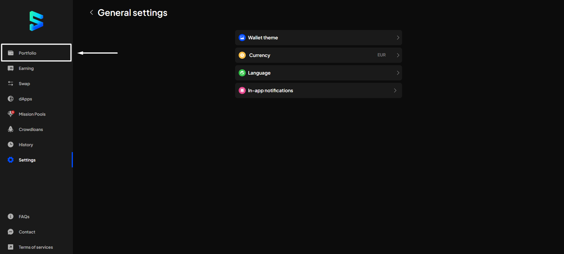 **Step 4:** Click the "**Portfolio**" tab on the sidebar to return to the SubWallet homepage.&#x20;