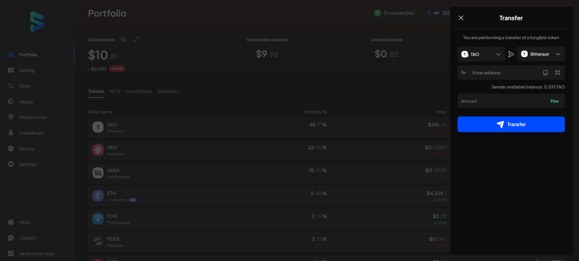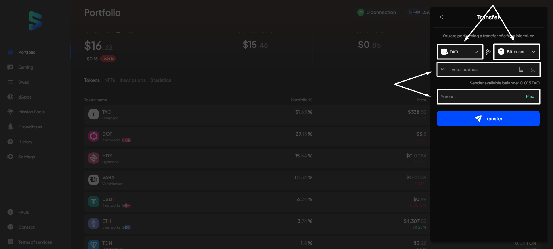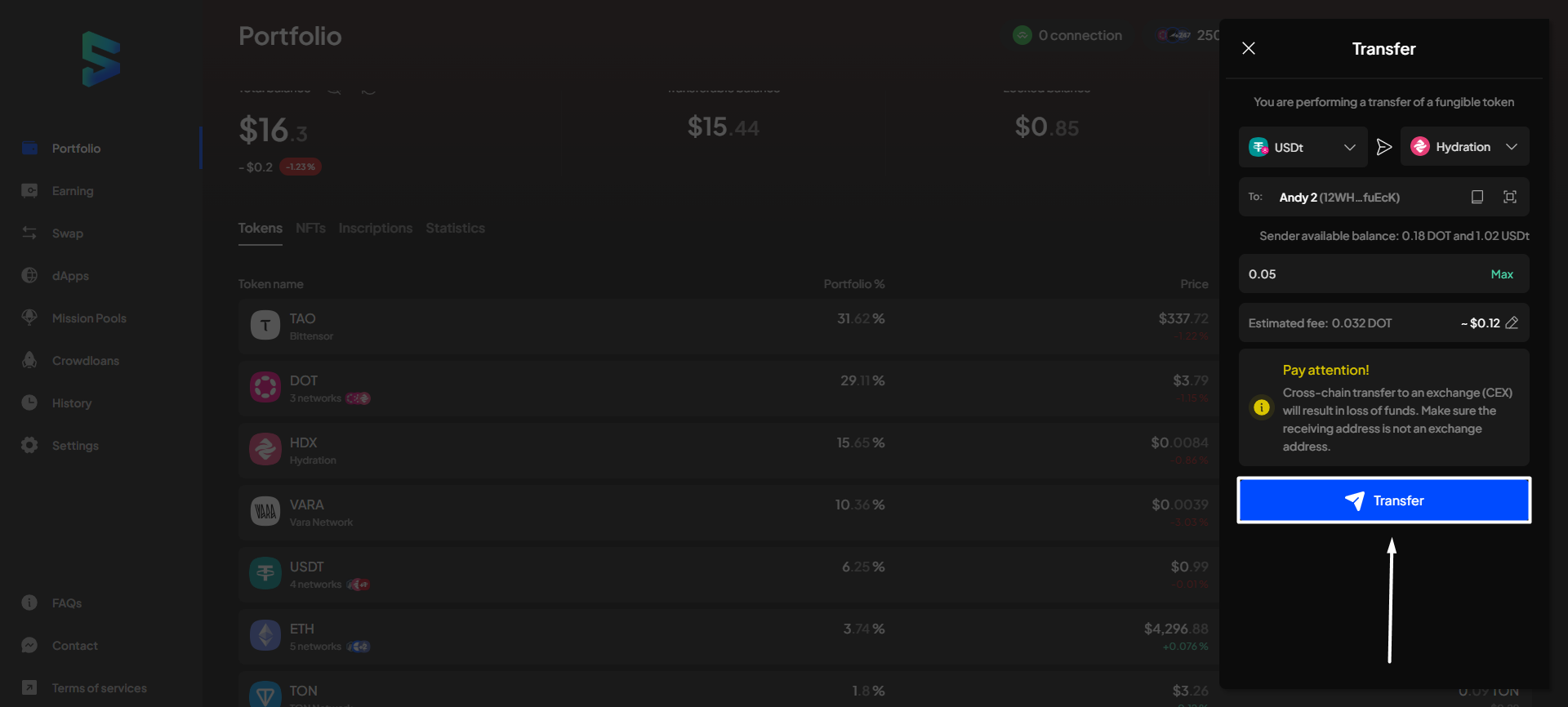 However, we strongly recommend not using this feature if you aren't an expert in transactions on the Polkadot ecosystem, as transferring to the wrong address will result in loss of funds.